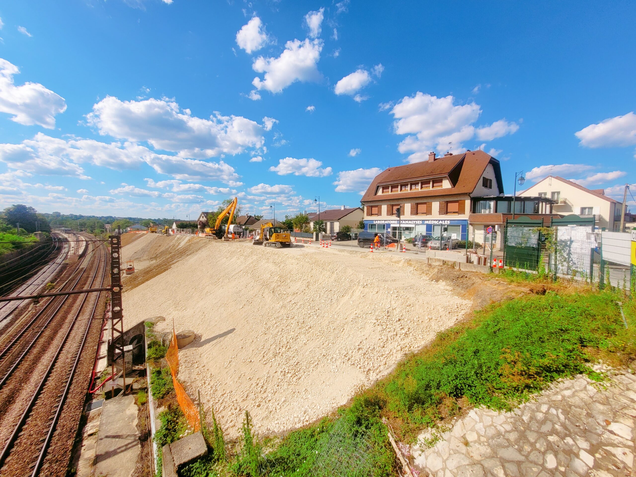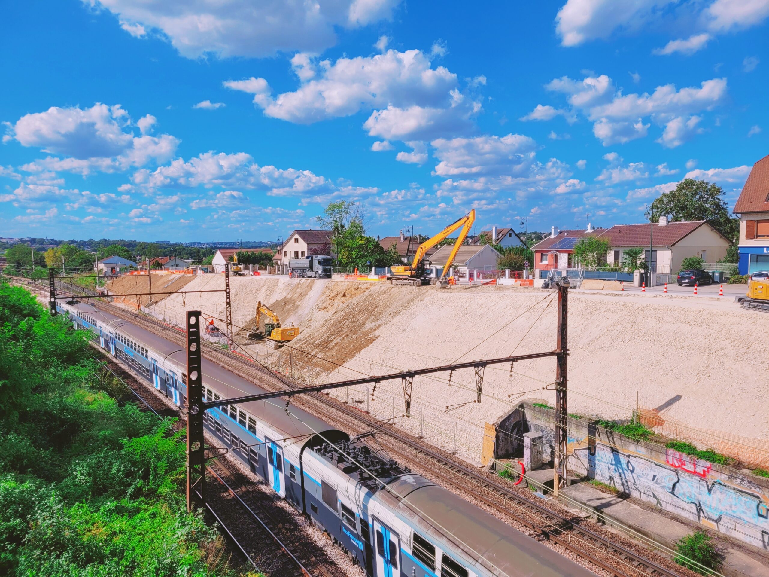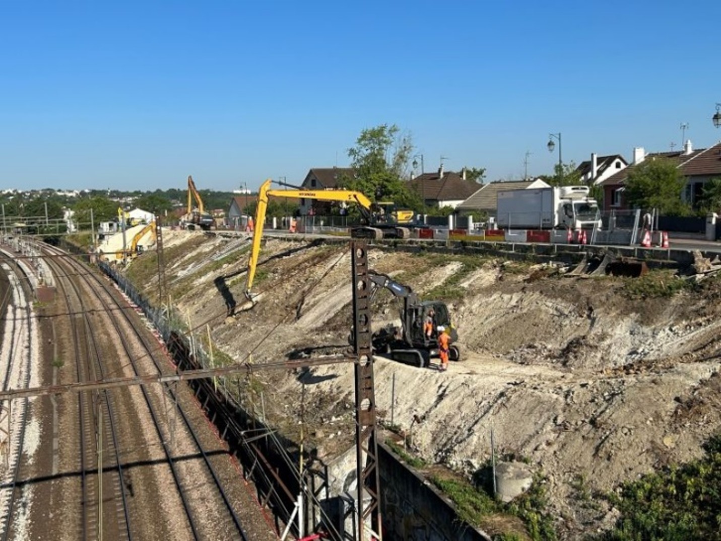 Les travaux ont consisté en l’évacuation de 8 000 m³ de déblais via une filière adaptée, l’acheminement et la mise en œuvre de 7 000 m³ de remblais de carrière (grave 0/80 et grave ciment), ainsi que la démolition mécanique, de nuit, de murs situés au-dessus des voies. Réalisée dans un contexte urbain contraint, l’opération a nécessité une organisation rigoureuse pour limiter l’impact sur le voisinage et les infrastructures environnantes.