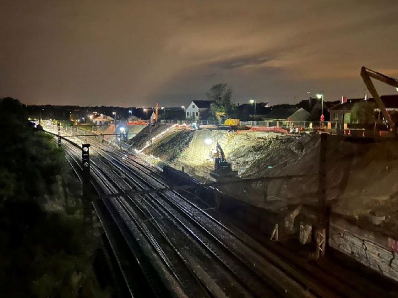Travaux réalisés de nuit pour limiter l’impact sur le trafic et le voisinage : confortement d’un talus menaçant les voies, gestion de déblais et remblais, et démolition de structures existantes.